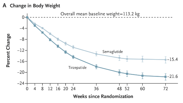 糖尿病ではない肥満患者を対象にした最新の研究では、リベルサスと同じ成分の注射剤(ウゴービ)とマンジャロによる体重減少効果を比較したところ、72週間の投与により、チルゼパチドで約-22.8kg、セマグルチドで約-15.0kgと、約1.5倍の差が見られました。