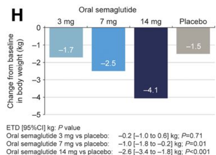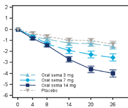 海外のPIONEER1試験(2型糖尿病患者約700人)では、26週時点でのプラセボ群との体重差(推定値)について、以下の通り報告されています。